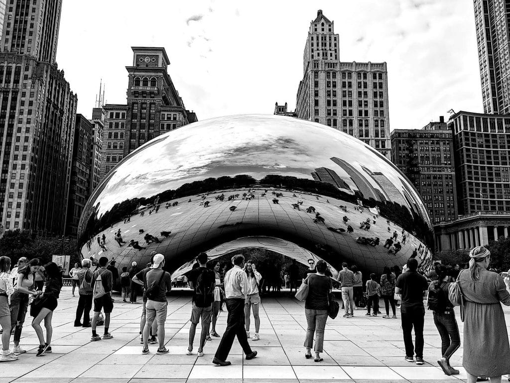 The Bean in Chicago, a shape that seems organic, harmonious, and fluid, expanding the space and reflecting and distorting the environment. Perfectly integrated into it, yet disturbing for the image it reflects of a deformed and frenetic society.