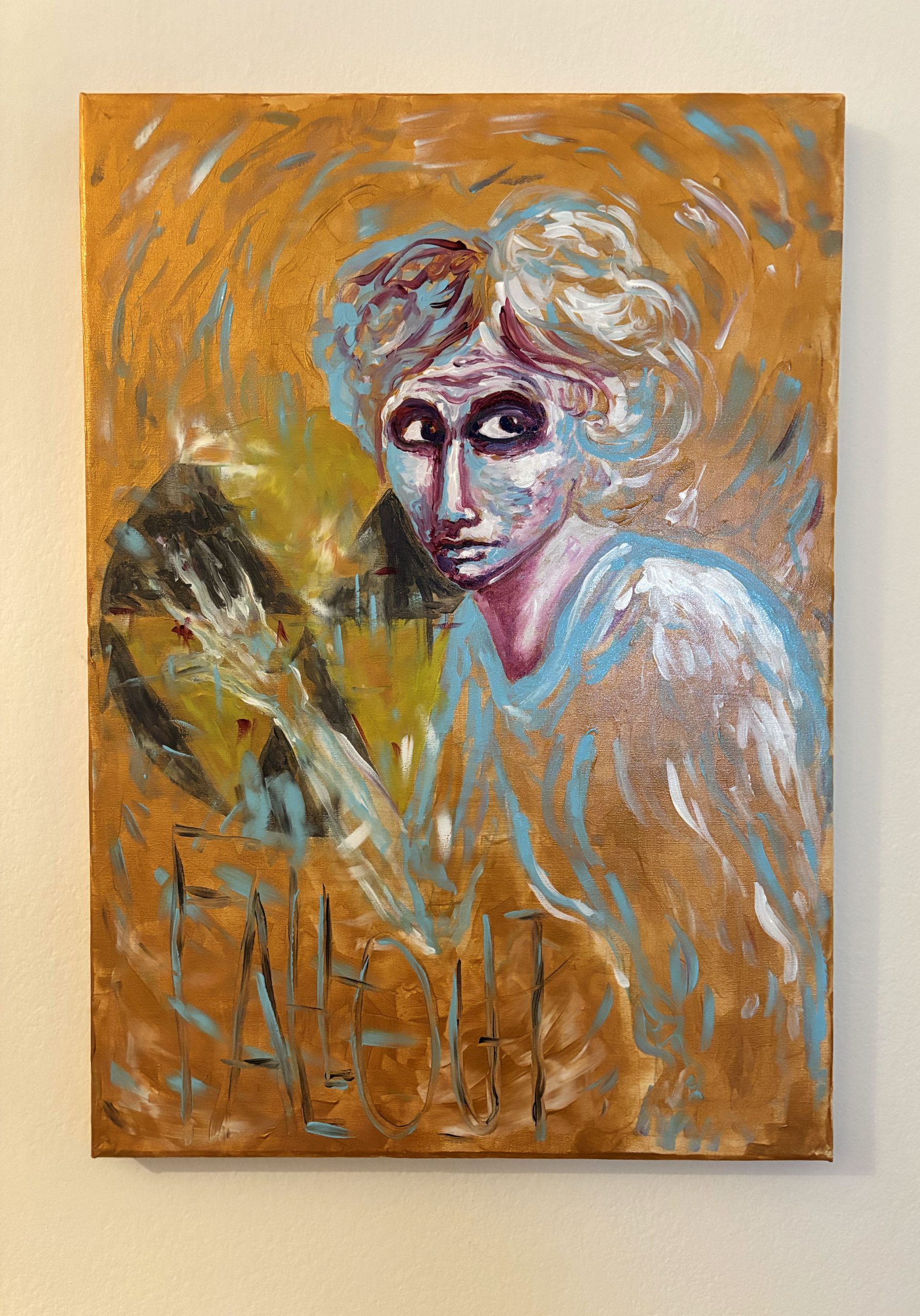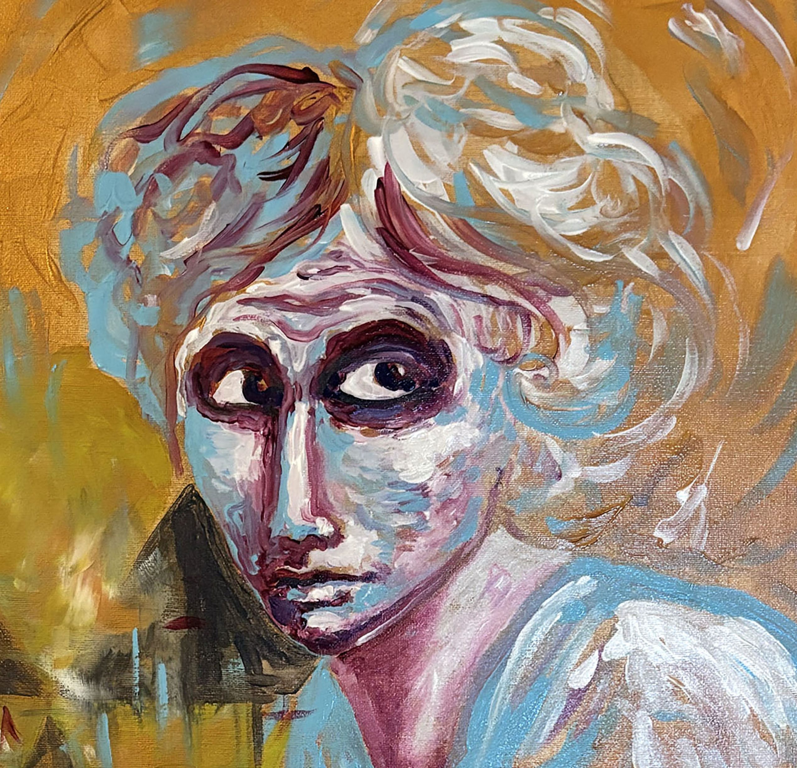 A fragile, almost dissolving figure emerges within a golden atmosphere. Wide violet eyes and a fading body suggest escape, fear, and disappearance into light and air.