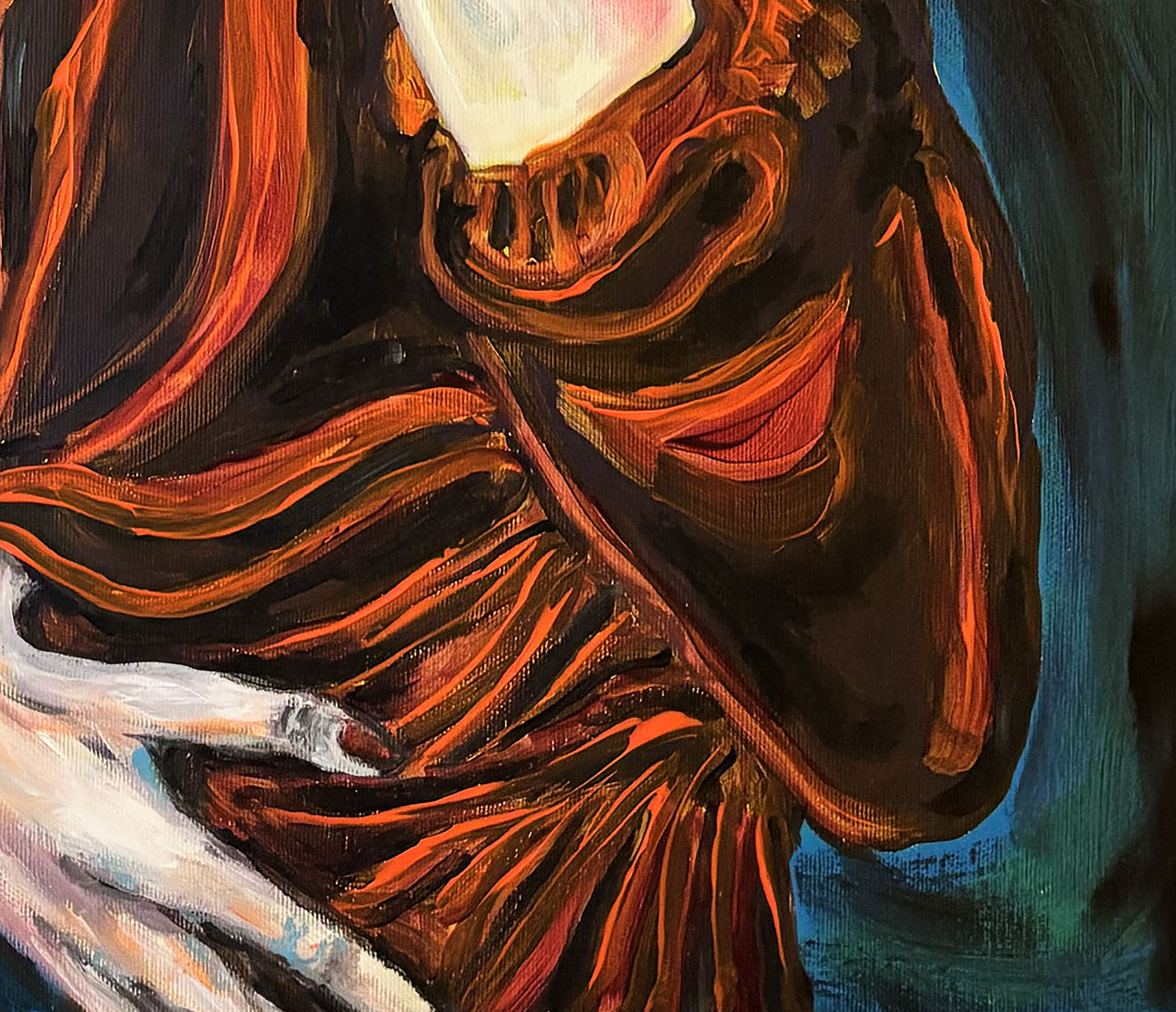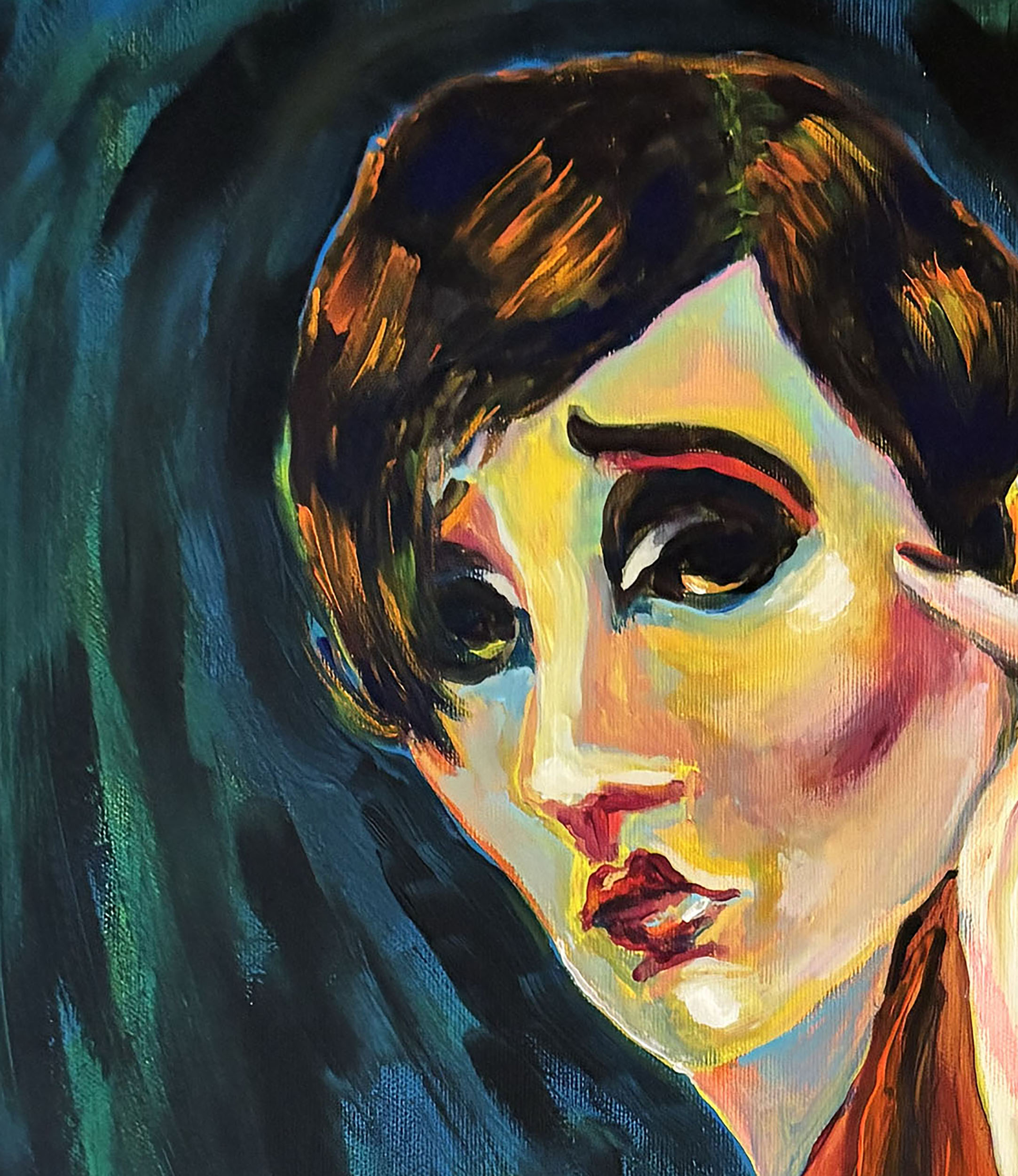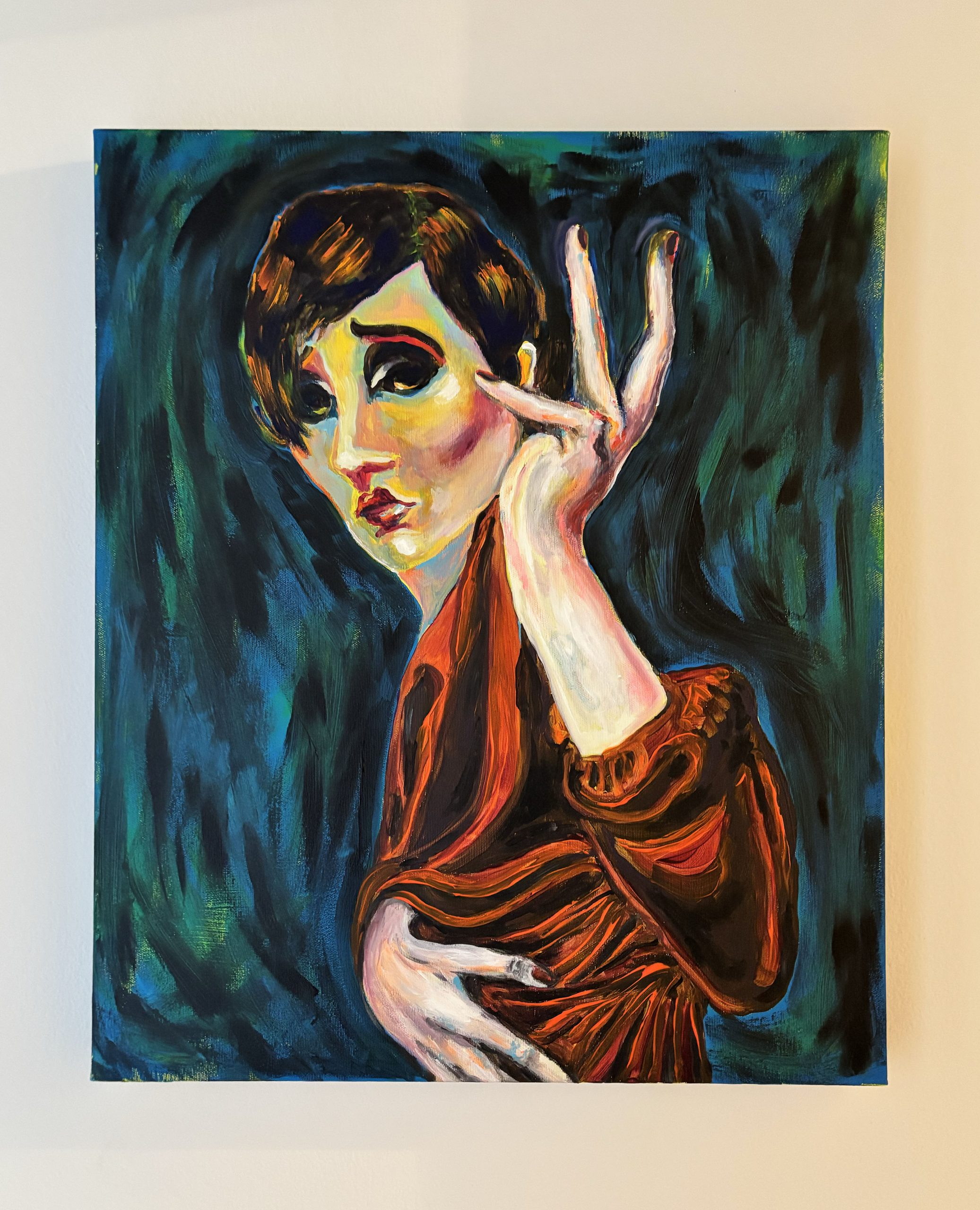 A single figure dominates the composition: Judith, caught in a suspended gesture, her raised hand suggesting what is absent rather than shown. The imagined presence of Holofernes becomes part of the viewer’s perception. Strong expressionist makeup and deep red-black tones intensify her presence.
