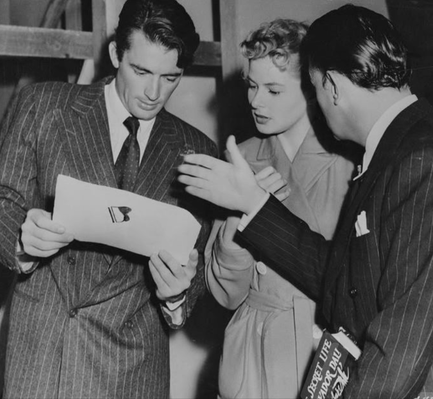 - In a photo from the set (now in the public domain), Dalí can be seen discussing a set design with Ingrid Bergman and Gregory Peck: the actors are intrigued and attentive, while he gestures as he explains the project. Dalí has a book about his life under his arm.